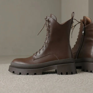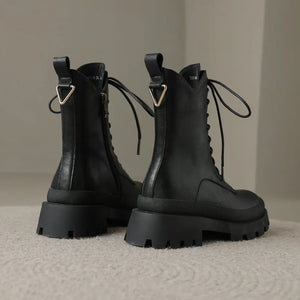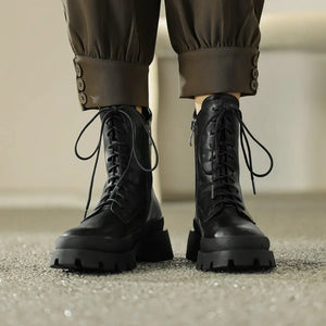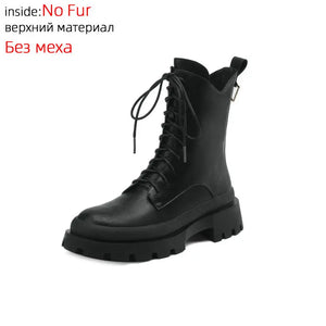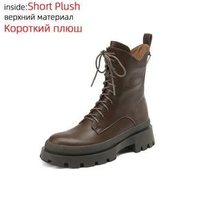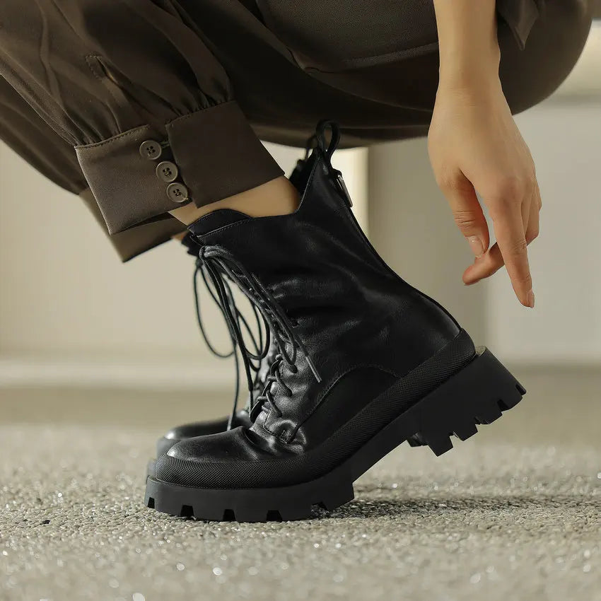 QUTAA 2024 Motorcycle Women Ankle Boots Thick Med Heels Round Toe Office Lady Cross-Tied Genuine Leather Shoes Woman Size 34-39