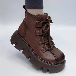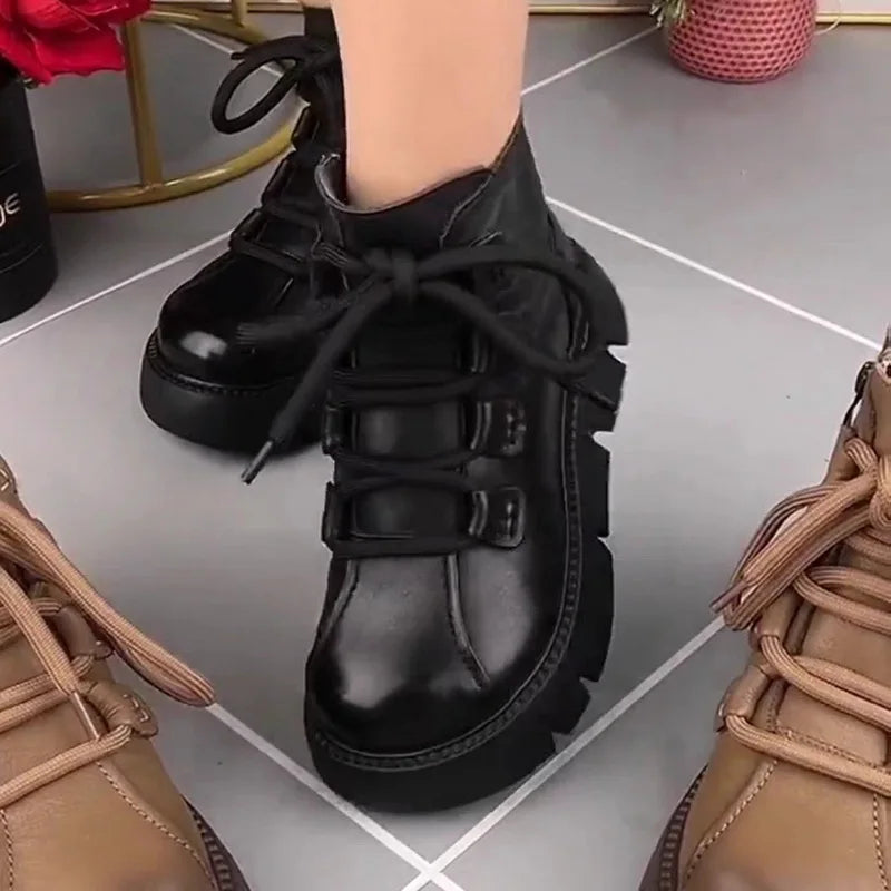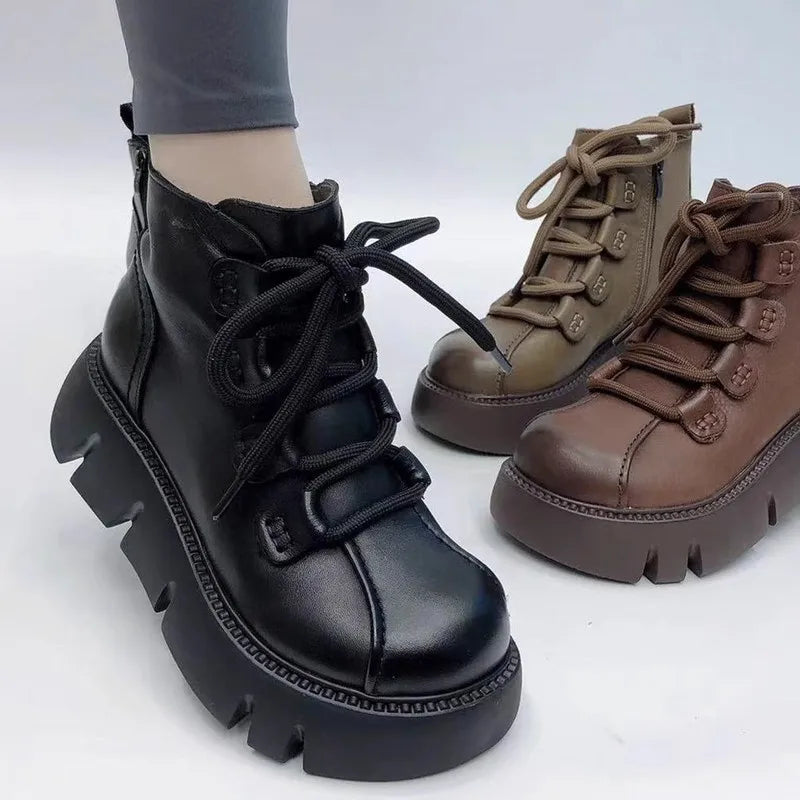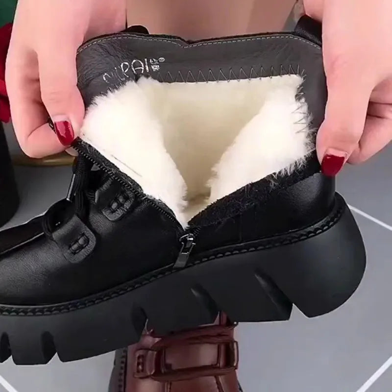 Snow Boots Womens Cotton Boots 2024 New Plush Warm Lace-up Shoe Soft Leather Anti Slip Thick Soles Elevated Motorcycle Boot