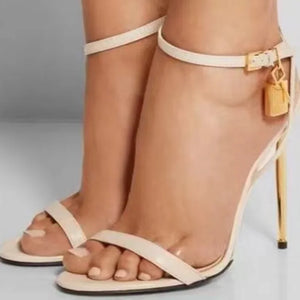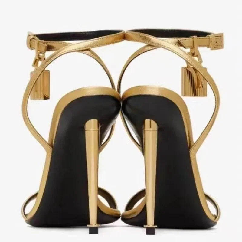 Summer New Concise 10cm High Heel Padlock Decorative Sandals European and American Fashionable Black Gold Women's Shoes 36-45