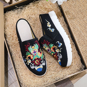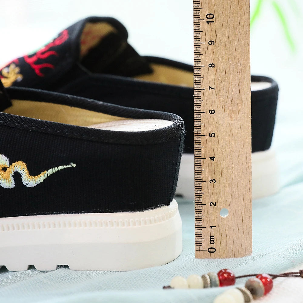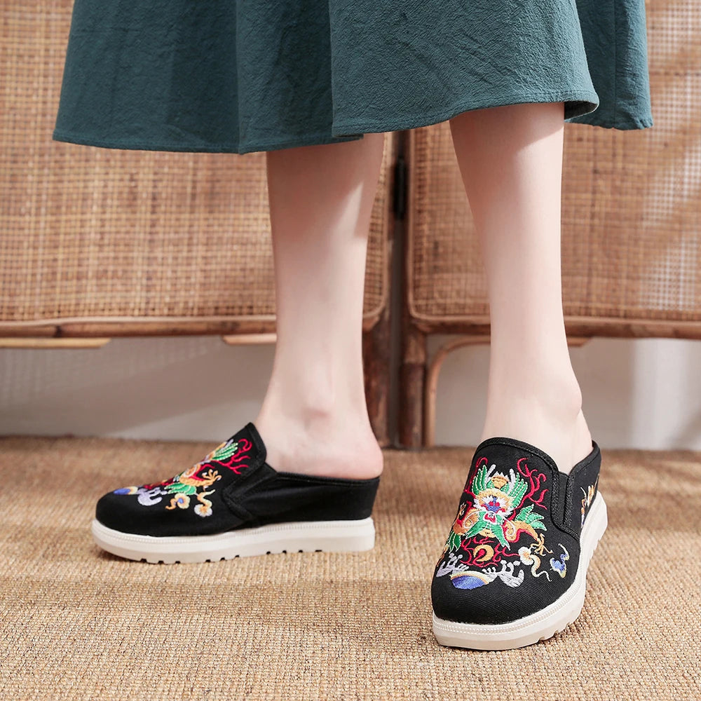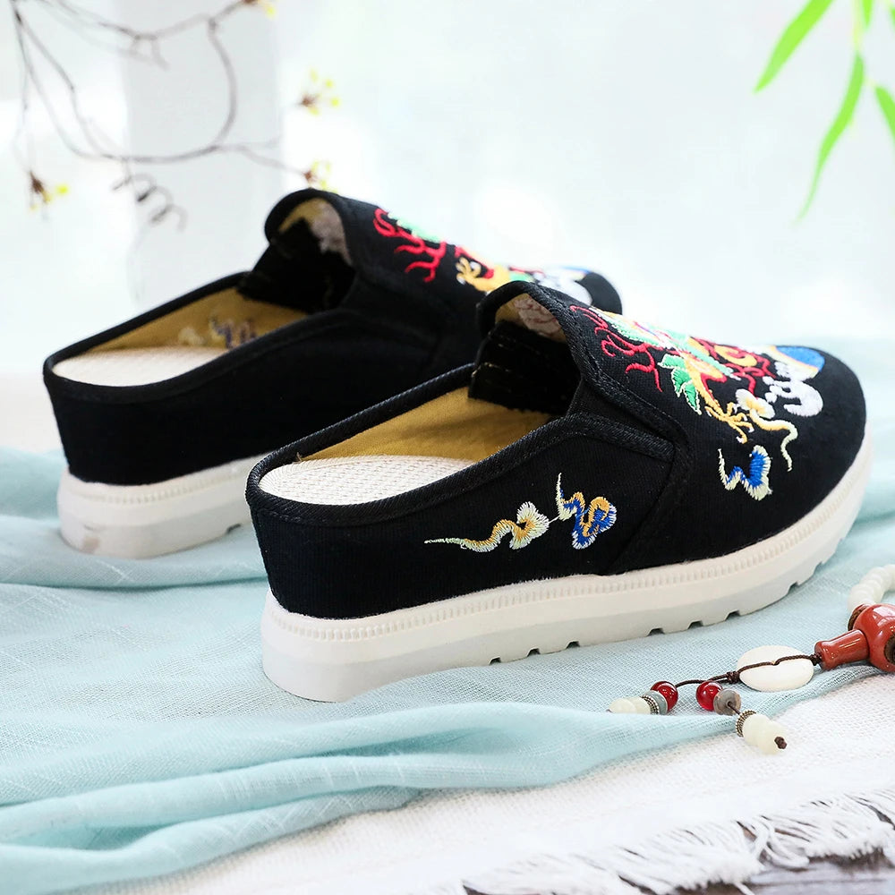 Veowalk Chinese Totem Embroidery Women's Casual Canvas Wedge Slippers Medium Hidden Heel Slip-on Comfort Platform Slides Shoes