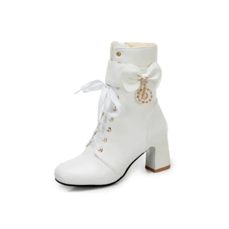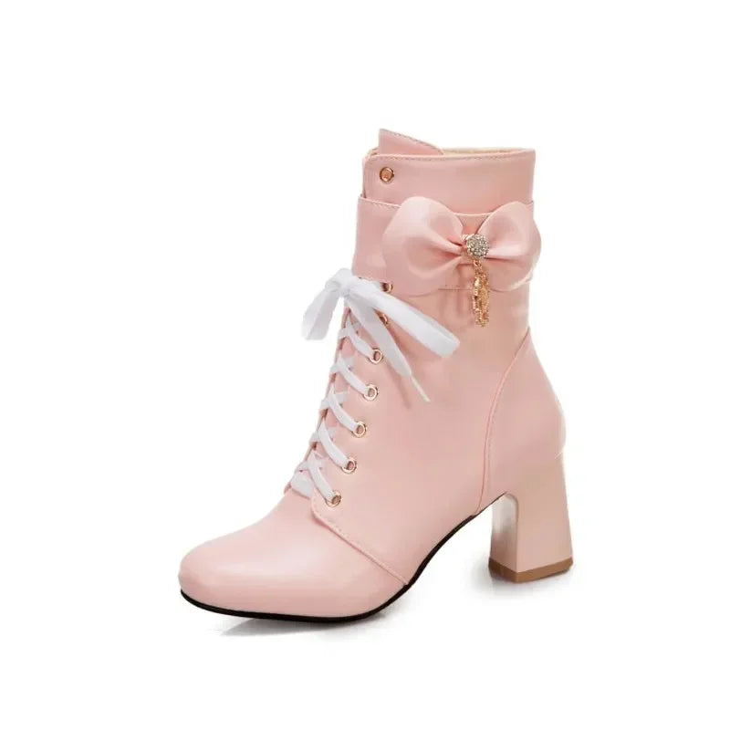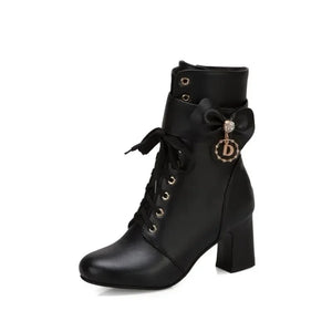 winter fashion British style Round head High heels women boots black white Pink sweet Butterfly-knot High heels Women boots