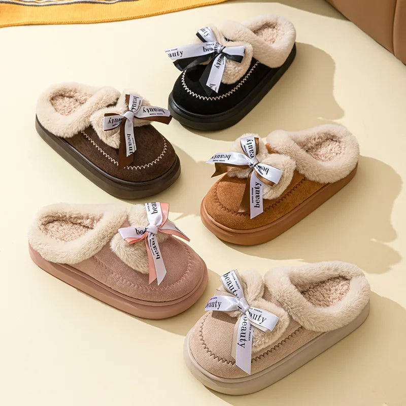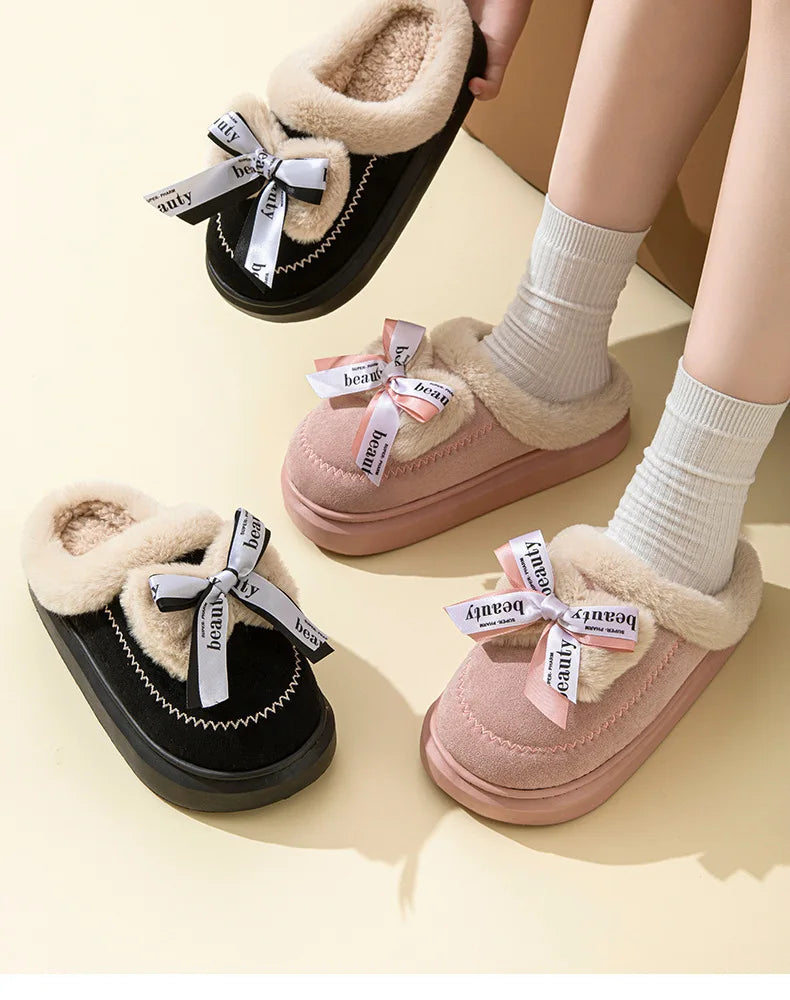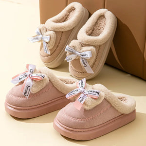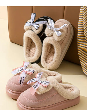 Winter Faux Suede Cotton Slippers for Women's Winter Home Rabbit Bow Cotton Slippers for Warmth New Thick Soled Princess Style