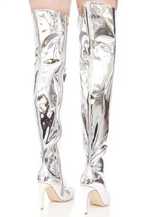 Women Boots Mirror Platform Pointy Toe Punk High Thin Heels Over The Knee Long Boots Autumn Winter Zip Silver Casual Party Shoes