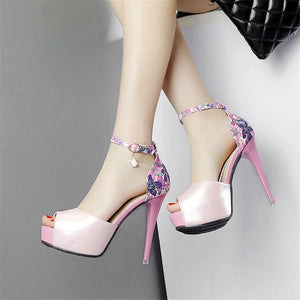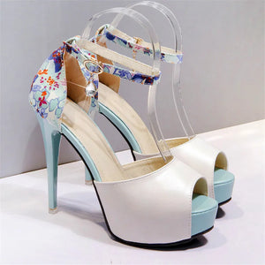 Women Fashion Floral Print Patchwork Sandals 2024 Summer Platform Super High Heels 12cm Lady Crystal Buckle Peep Toe Shoes Party