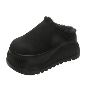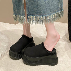 Women Platform Fur Slippers Suede Mules Shoes Winter 2025 Trend Casual Snow Boots Short Plush Warm Cotton Shoes 10CM High Heels