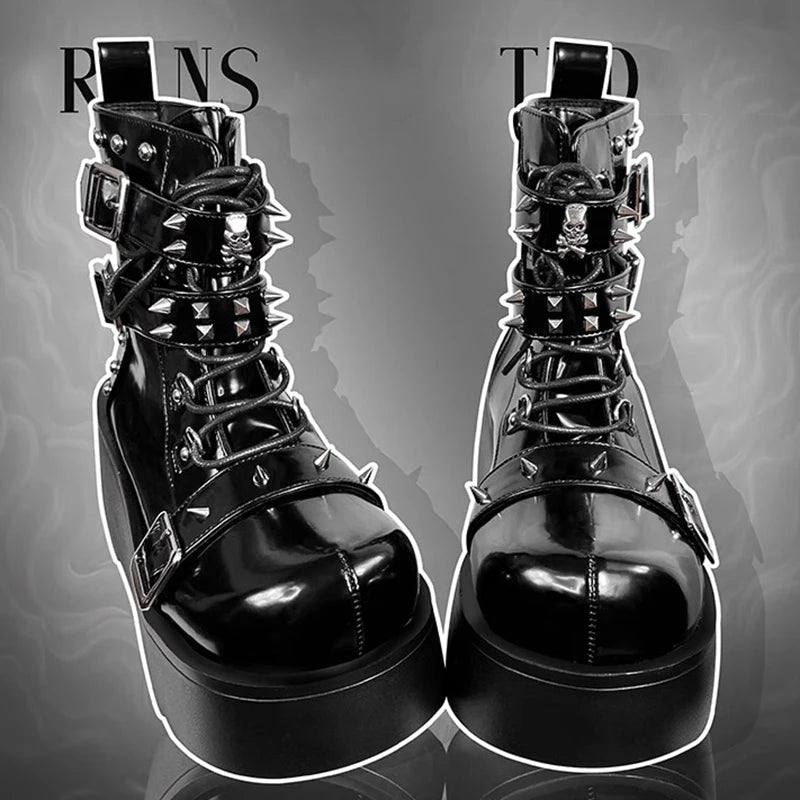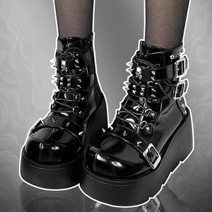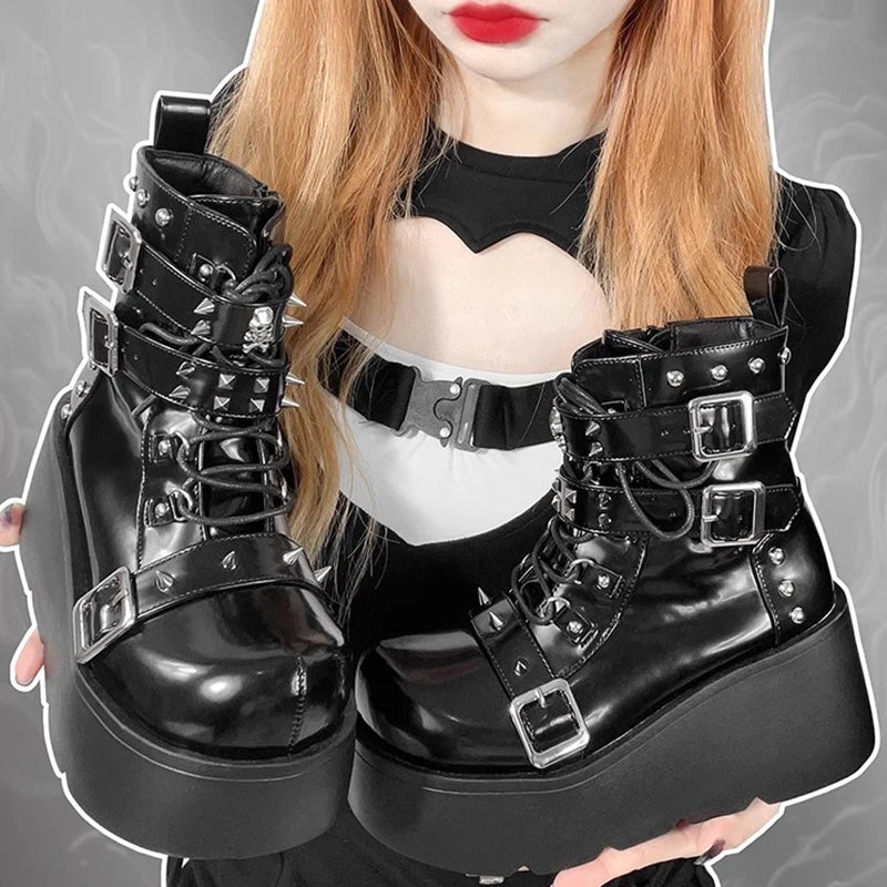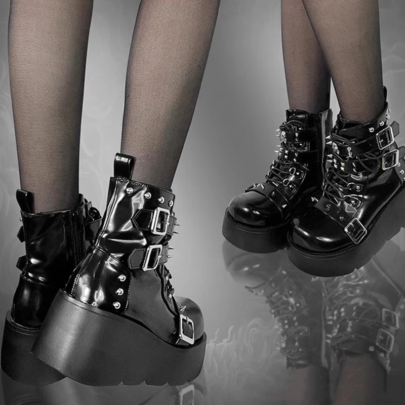 Women Punk Boots PU Leather Rivet Buckle Design Shoes Cool Retro Chunky Wedges Platform Boots Lace Up Casual Outdoor Shoes 35-40