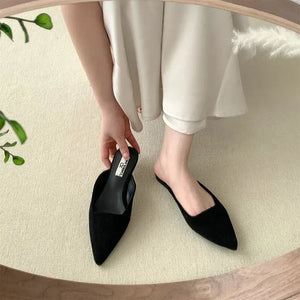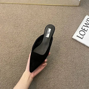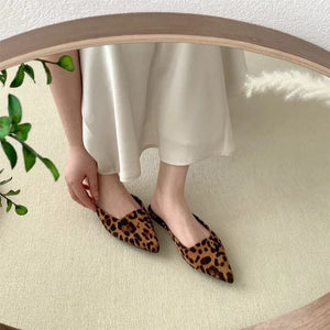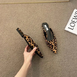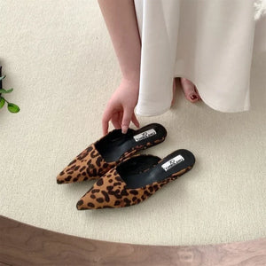 Women Slippers Pointed Toe Leopard Design Shallow Slip on Thin Low Heels Black Flock Design Casual Mules Loafers Black Outdoor