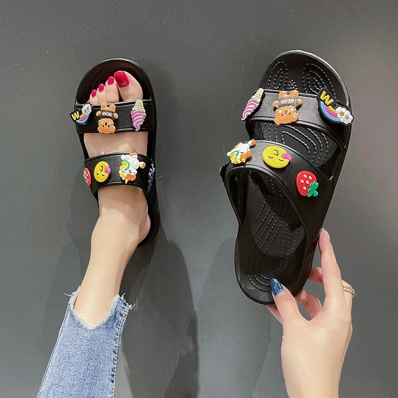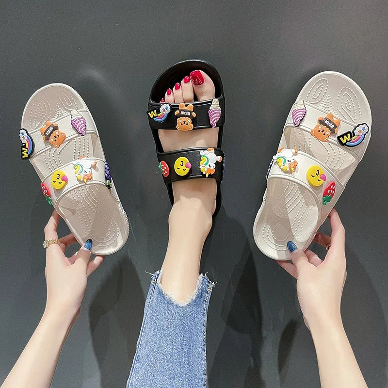 Women Summer Casual Slides Comfortable Flax Slippers Striped Cartoon Flip Flops Platform Sandals Ladies Outdoor Shoes