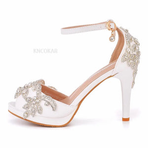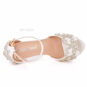 Women Wedding Shoes Bride Sandals White Rhinestones Silver Platform Dress Thin High Heels Ladies Pumps
