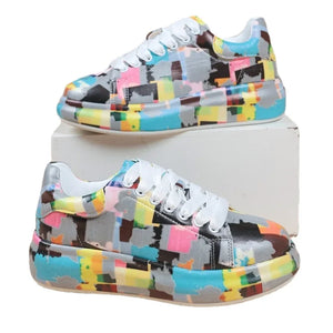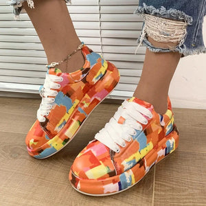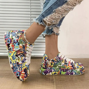 Women's Casual Sneakers 2023 Fashion New Painted Graffiti Lace Up Sports Shoes for Women Flat Pu Leather Ladies Running Shoes