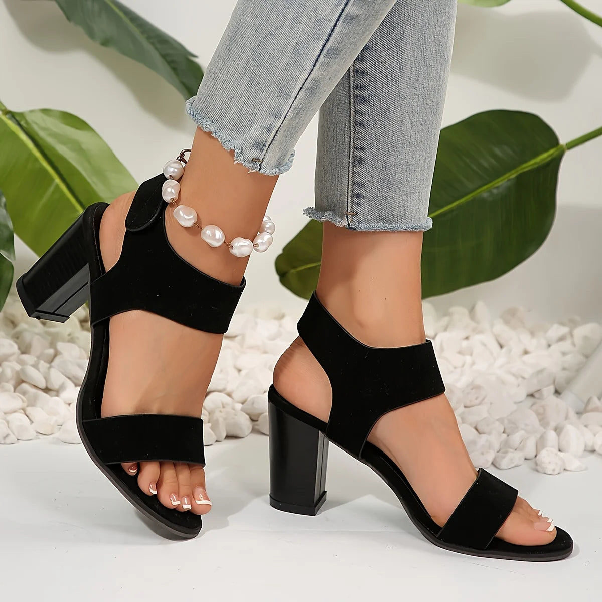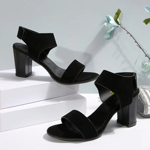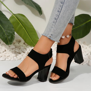 Women's Fashion High Heel Sandals, Black, Chunky Heel, Wide Strap, Magic Tape Closure, Breathable Fabric, Faux Leather Lining, R