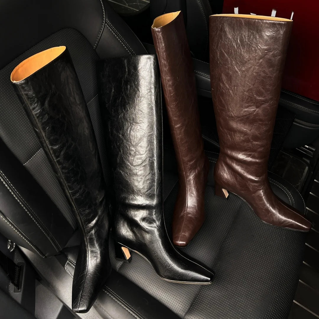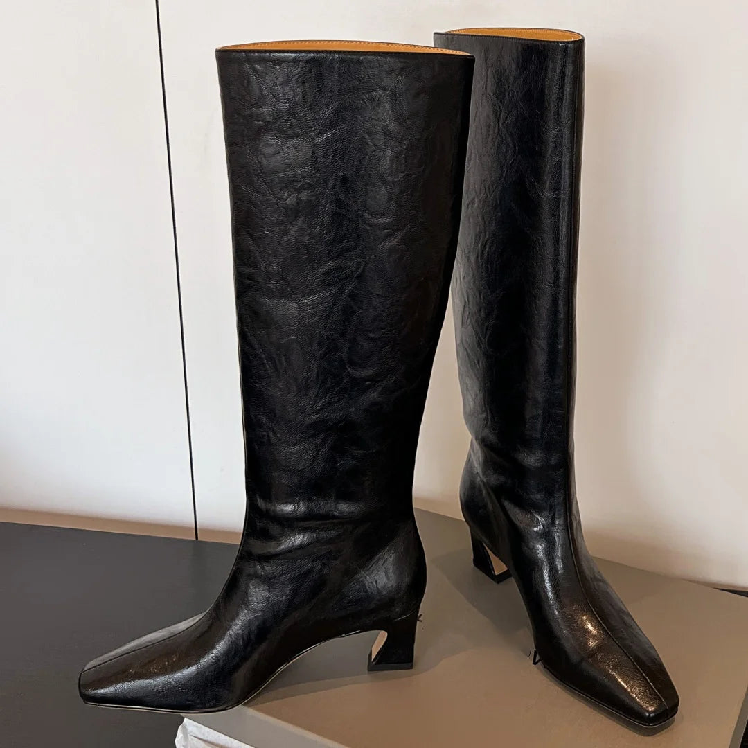 Women's genuine leather 5.5cm thin high heel square toe slip-on autumn knee high knight boots elegant ladies long boots shoes