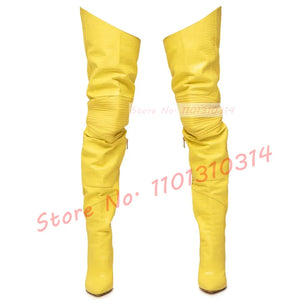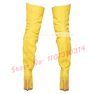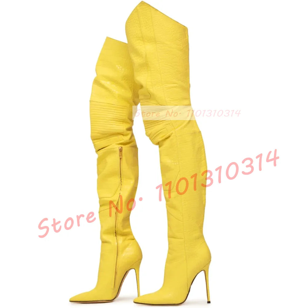 Yellow Croc Pattern Long Boots Women Sexy Trend High Heels Over Knee Shoes Summer Leather Splicing Luxury Pointy Fashion Boots